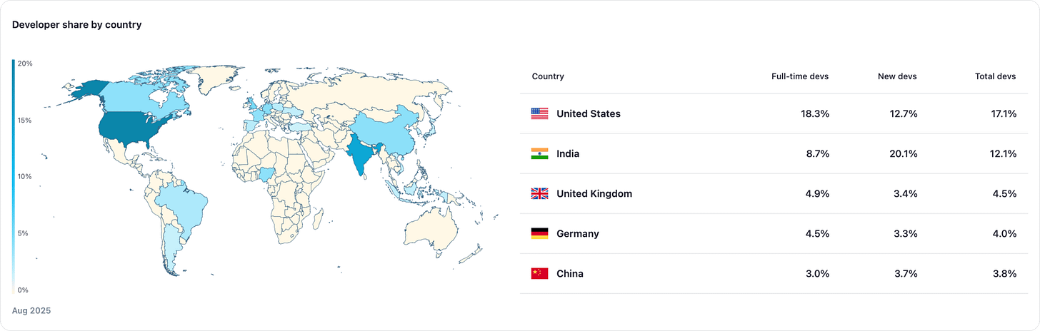 India onboarded the most new crypto developers in 2024. It has been the largest country for new crypto developers since 2023. The top three ecosystems adopted by active Indian developers are Solana, Ethereum, and Base.
