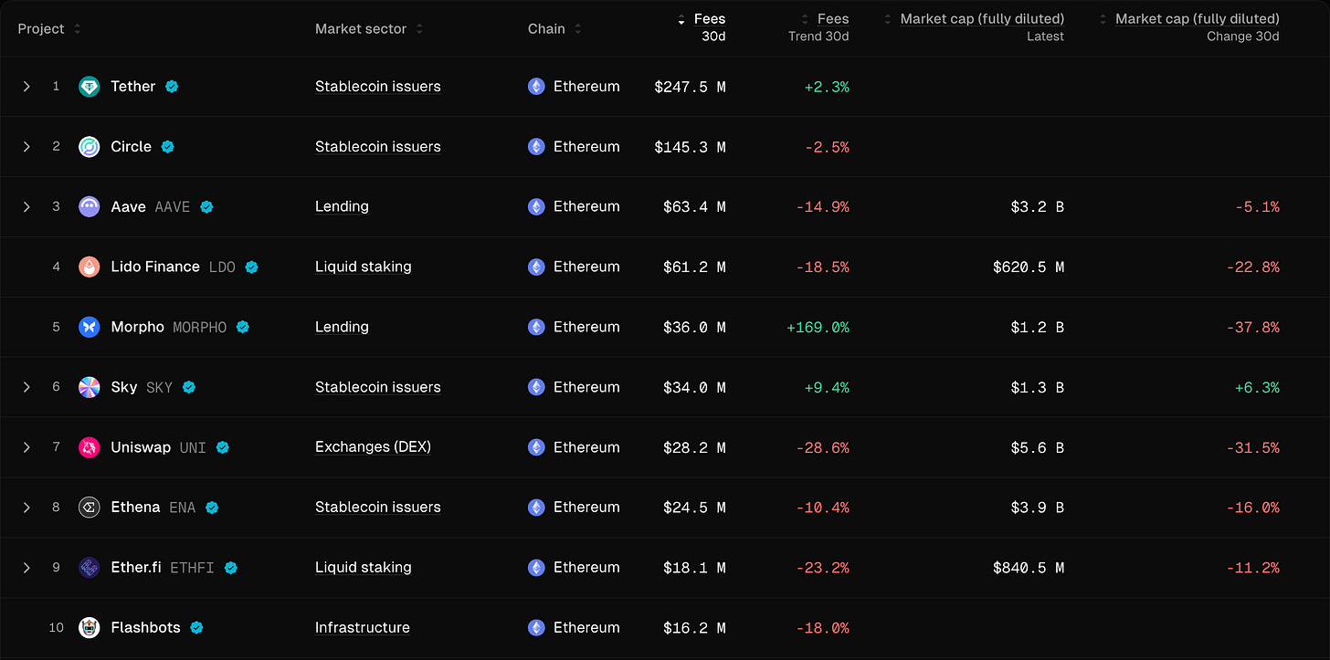 cr: https://defillama.com/stablecoins/ethereum Top 10 projects who generate the most fees on Ethereum: