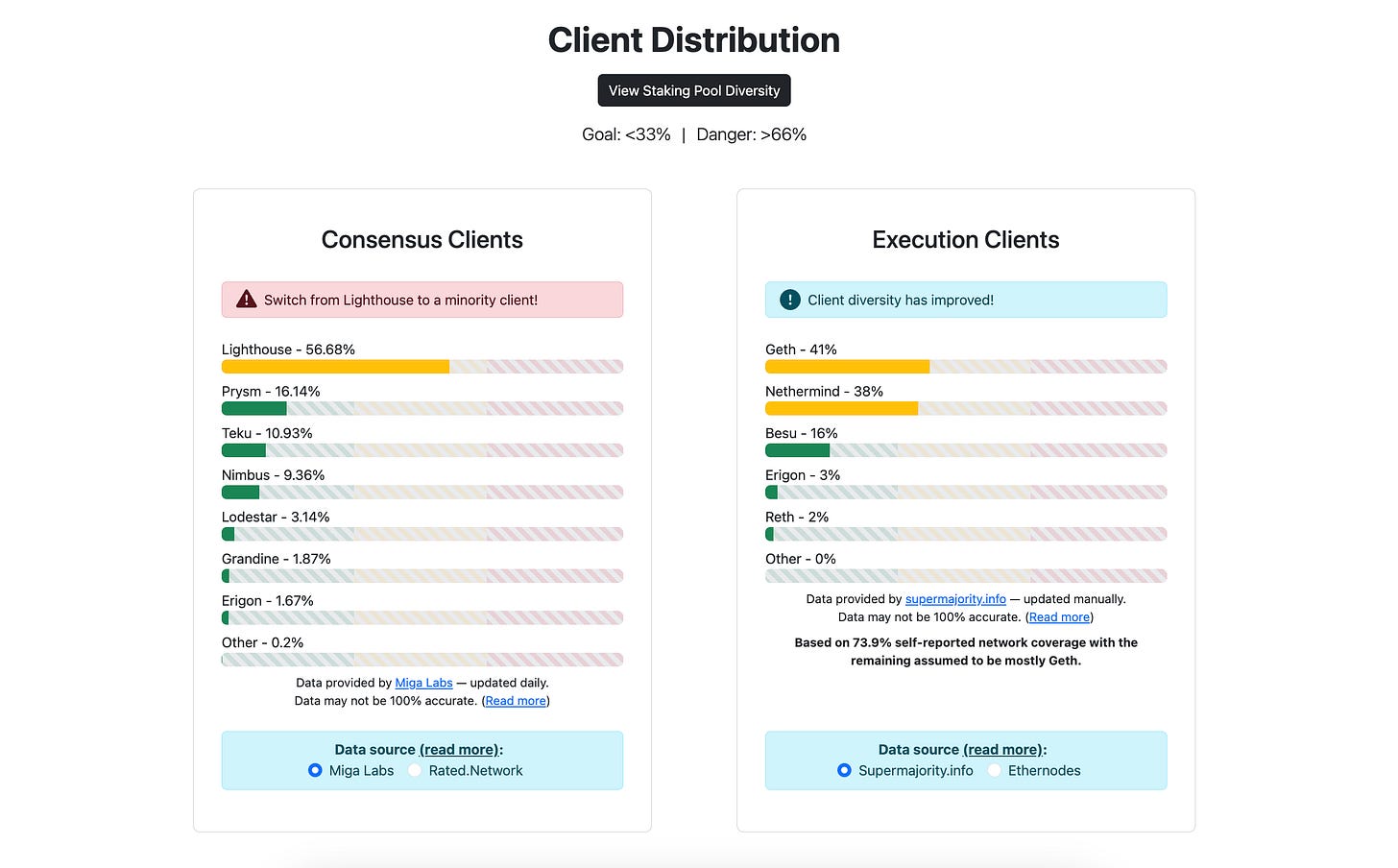 Execution client diversity has improved, but for consensus clients, please switch from Lighthouse to a minority client!