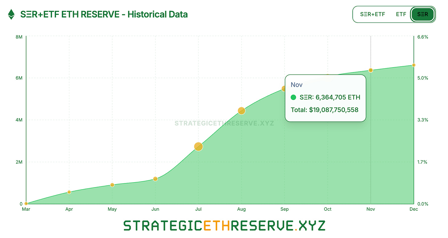 Holdings across 68 entities rose 4.8% MoM to 6.36M ETH in November. Total value stood at $19B, down from $23B in October.