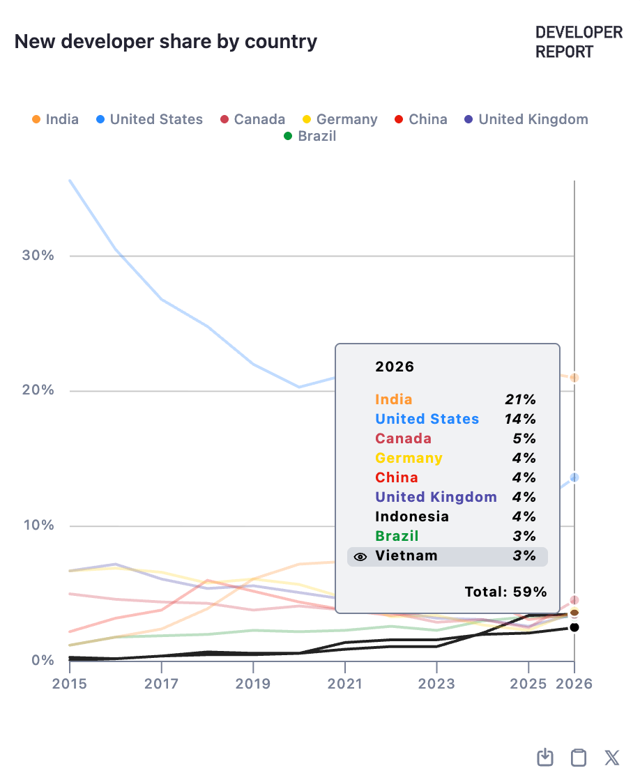 Vietnam ranks 8th globally for new blockchain developer share (3%), alongside Germany, Indonesia, China, Canada, and Turkey, trailing only India (22%) and the US (14%)